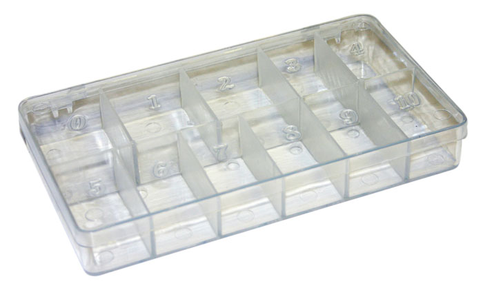 Large compartments to accommodate any style nail tip. Large, 11 compartment